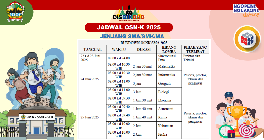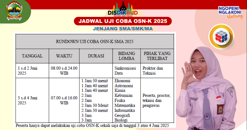 | 2 | Uji Coba OSNK Uji Coba OSNK di SMA Negeri 2 Batang akan diikuti peserta OSN-K sebanyak 45 siswa dalam 9 mata pelajaran yang dilombakan dengan jadwal sebagai berikut: